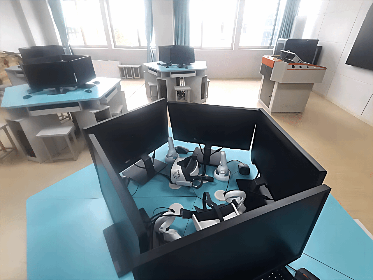(2)509学前教育虚拟仿真实训室,配有1套智能交互一体机,8套小组显示一体机,1套学前岗前实训虚拟仿真系统,为学前专业的智慧教室。该功能室是为响应高校数字教室和未来教室发展的需求而建,可实现无尘教学,保护师生身体健康,教师可在学生端屏幕上操作电脑,安排特殊任务,学生也可在各自终端电脑上完成指定任务而互不干扰,方便实现师生交互式课堂教学。