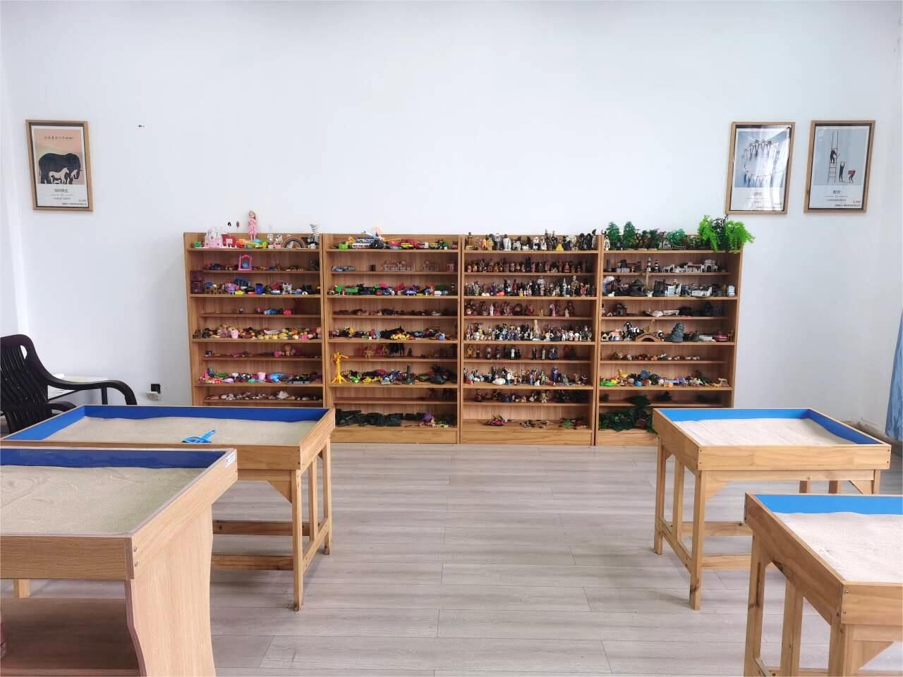 (10)604沙盘游戏实训室,位于西校区行知楼六楼,使用面积37.54m2。配有个体沙盘2个,团体沙盘1个,沙具架4个,沙具近3000个,沙具种类齐全、丰富。能满足个体沙盘(干、湿沙盘)、团体沙盘的辅导与培训及咨询、教学实践需要。是应用心理学专业《沙盘疗法》实践课及全校师生第二课堂《沙盘游戏疗法》的实训场所。通过系统学习沙盘游戏疗法,不仅可以提高师生自身的心理健康水平与团队合作意识,还可以让学生掌握沙盘游戏疗法的基本原理与技巧,为其以后在学校尤其是中小学及幼儿园开展心理健康教育和咨询、辅导奠定良好基础。