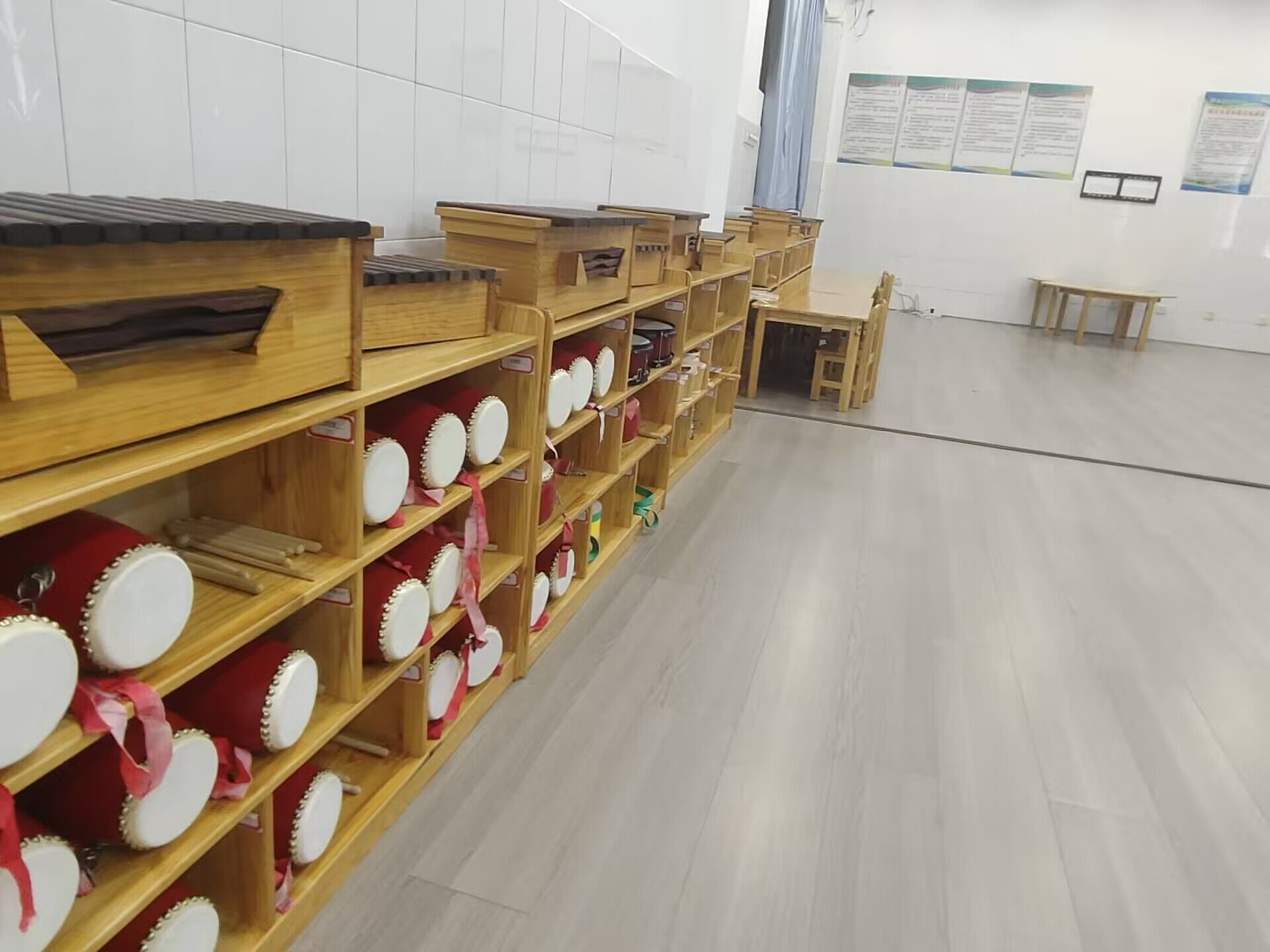 (11)707奥尔夫音乐教育实训室,位于西校区行知楼七楼,建筑使用面积为70m2,可与705儿童行为观察室联动使用。实训室配备奥尔夫音乐器具1套、教具柜12个、学生月亮湾桌2张、学生桌20张、学生椅40把。为学前教育专业学生提供较为完整的奥尔夫音乐教育所需设备和空间。该实训室主要承担学前教育专业《奥尔夫音乐与教学》《幼儿游戏与指导》等课程的实践教学工作。奥尔夫音乐教学法是让学生自己作为参与者参与并体验节奏乐器的演奏和律动,在学生进行节奏朗诵、音乐游戏、歌唱、舞蹈、绘画、参演小剧场、演奏奥尔夫乐器及拍手跺脚等人体乐器活动过程中,不仅能感受并享受音乐带来的快乐,还能让学生基本掌握奥尔夫音乐教学的方法和技能,为将来从事幼儿园奥尔夫音乐教学奠定坚实的基础。