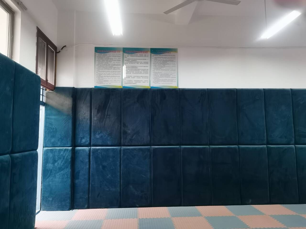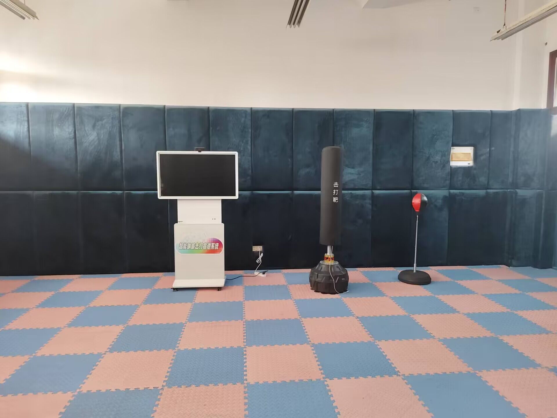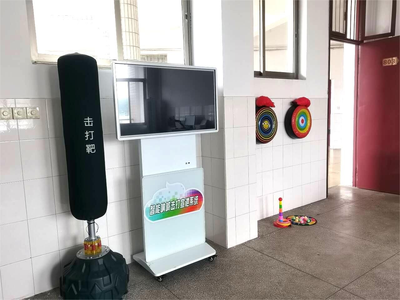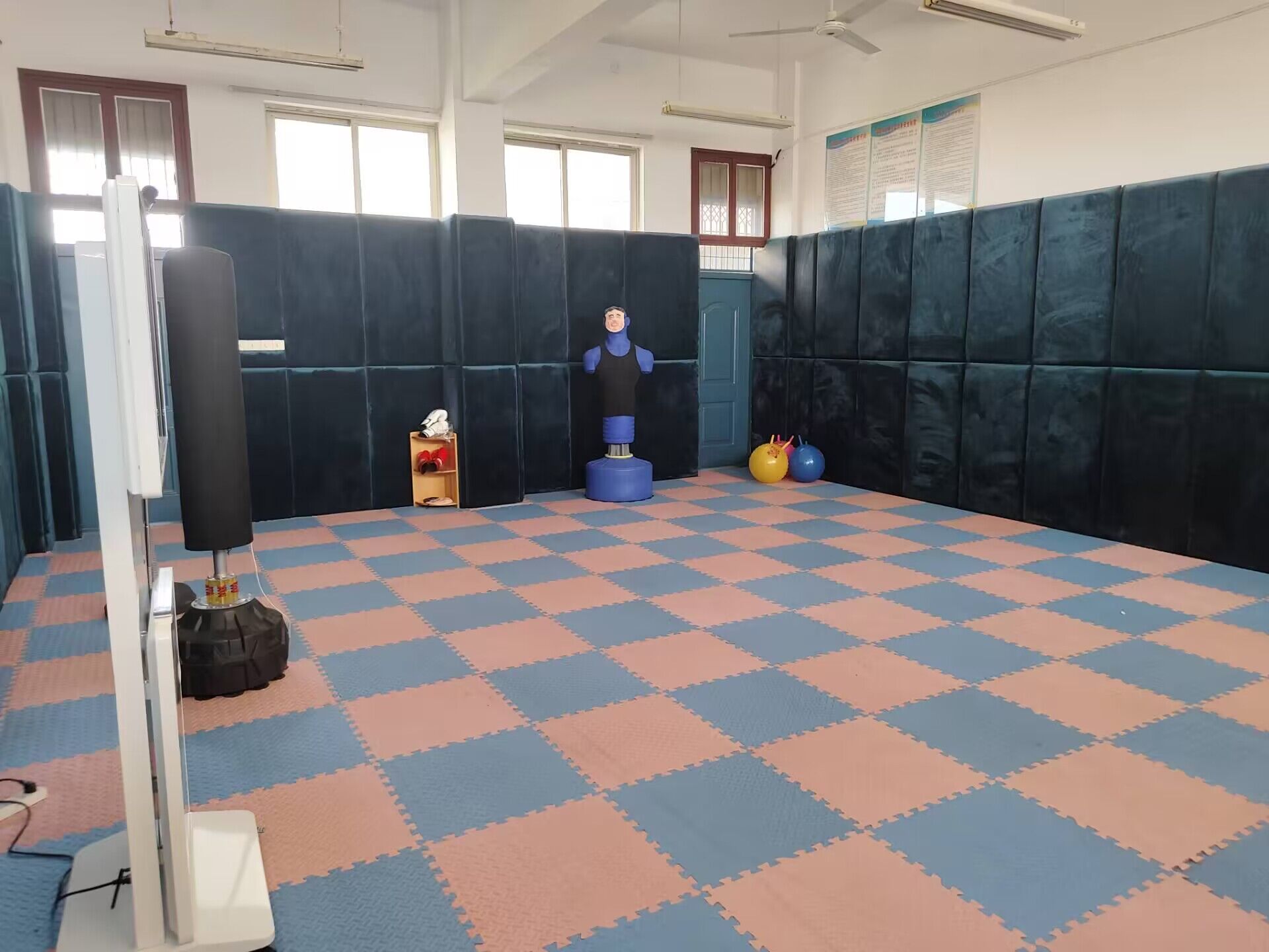 (12)801心理发泄室(建设中),位于西校区行知楼8楼东端,建筑使用面积为37.54m2,是供来访师生宣泄情绪的场地。该教室四周的墙体被厚实海绵包成了软墙体,地面铺着厚厚的格子地毯。配有1套智能击打呐喊情绪疏导系统,该系统是以人机交互技术为基础,融合多媒体系统模拟情景,精确测量和剖析宣泄者击打幅度、工作频率和延续时间,依据不一样的宣泄主题创建正方向宣泄情景,进而有效地清除焦虑情绪、焦虑不安、不自信等不良影响,正确引导宣泄者积极主动宣泄不良情绪,协助宣泄者创建自信心、找到自身的优势。该功能室还配有1个竖立的可供学生击打的橡胶人、1个沙包,2个宣泄球及一些拳击手套和其他可供随意踢打的道具。来访人可以对竖立的橡胶人和沙包进行任意踢、打,也可在室内滚动、呐喊、吼叫。有助于他们将内心压抑的情绪和心理能量以一个更为安全、合适的方式排解、释放,实现情绪宣泄和心理减压、恢复心理平衡的效用。