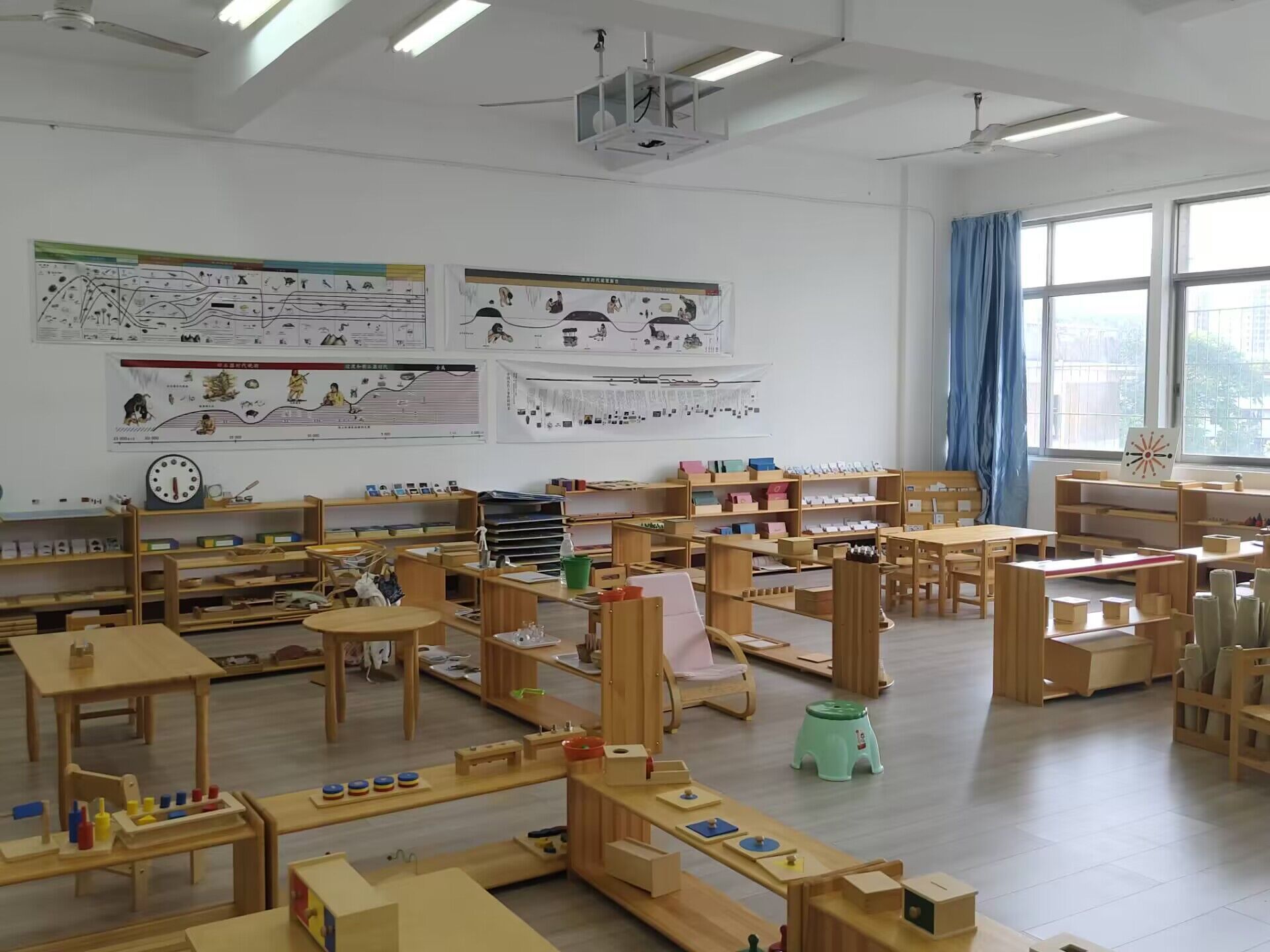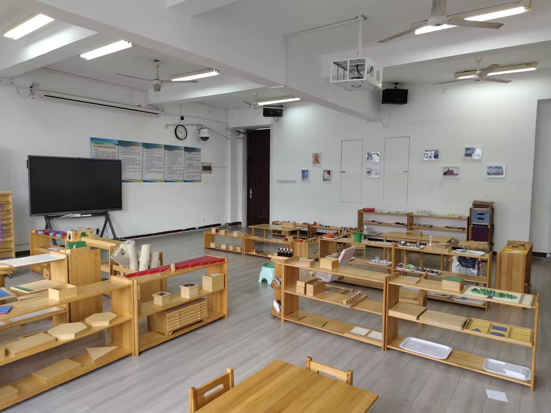 (6)611蒙台梭利教育实训室,位于西校区行知楼六楼,建筑使用面积为80m2,是学前教育专业实训系统的重要组成部分。实训室配备专业的蒙台梭利五大类教具,并包括一个0-3岁幼儿的蒙氏教育模拟区域。学生可在实训室进行蒙氏教学观摩与操作、蒙台梭利教具使用训练、蒙氏教学模拟,还可实施相关的实验、观察研究活动。为学前教育专业的师生提供岗前、在职实践训练和实验研究提供场所。
