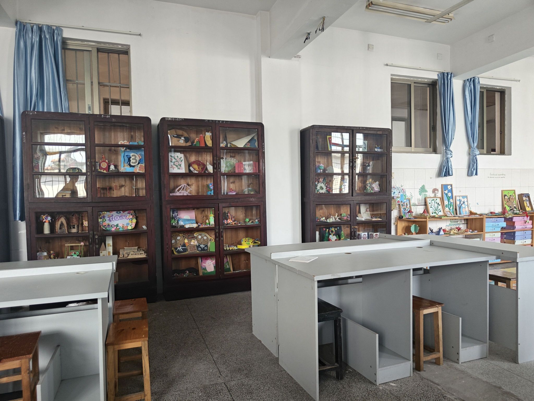 (4)609美术手工实训室,建筑使用面积为80m2。本实训室为学生美术手工制作专用教室,学生在该实训室可进行海绵纸装饰手工制作,台灯、风铃、笔筒、衣服、玩教具、房屋的设计与制作等。实训室配备多个工作台和100套手工制作工具箱,能为教师授课和学生的直观学习提供极大便利。该实训室还配置了幼儿手工制作区域及手工作品展示区域,既可以满足学生实践幼儿园手工制作、环境创设教学能力,也可以训练学生团队合作精神、使学生间相互学习、促进,还可以陶冶学生艺术情操、培育学生师的情怀。