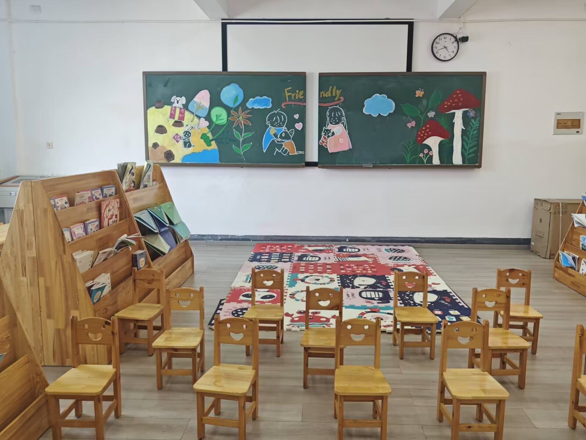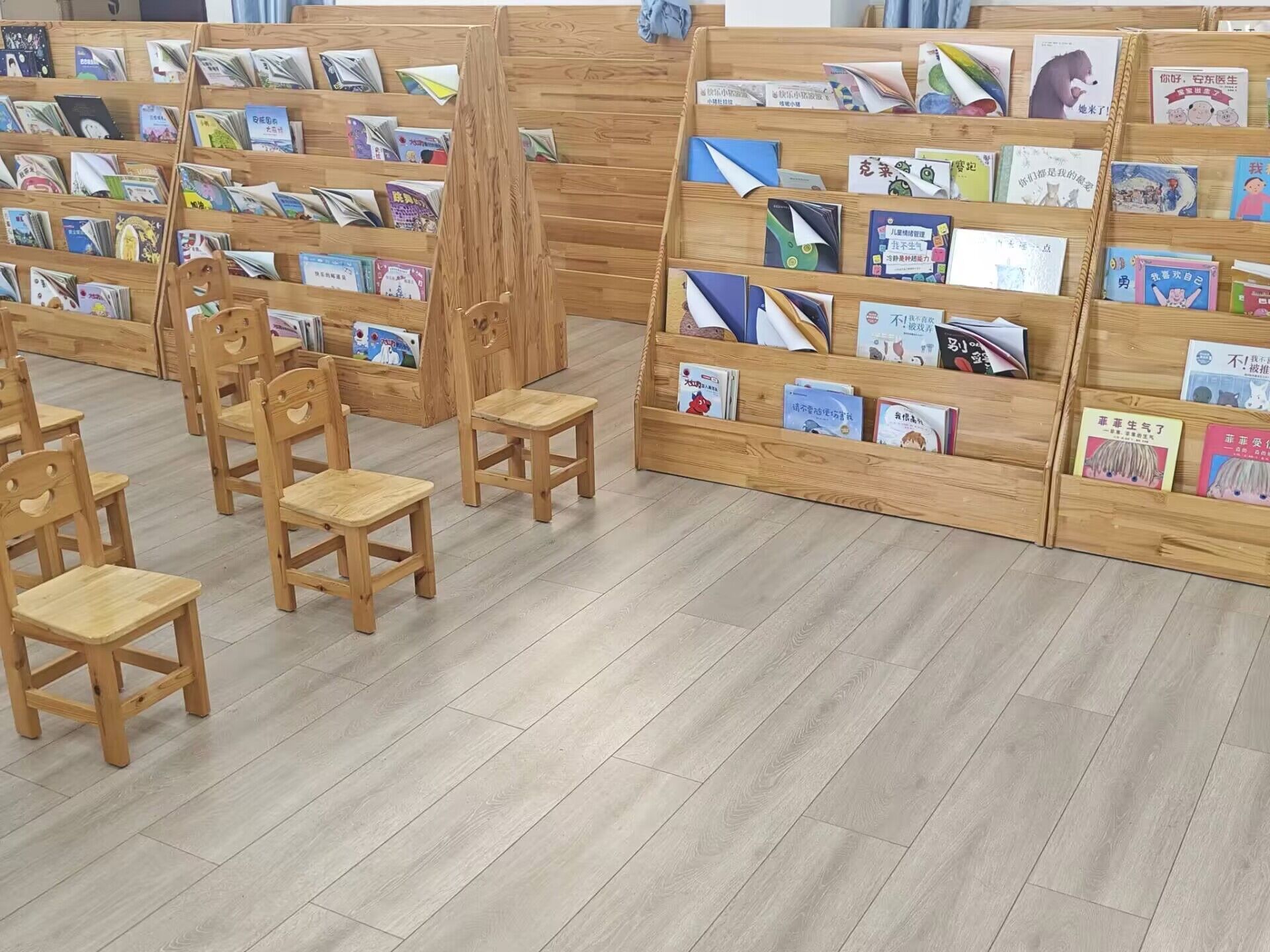 (5)610绘本室,建筑使用面积为80m2。配有大量适合3-6岁儿童阅读的国内原创及国外引进的精品绘本约1000本,面向全校师生、家属及合作幼儿园师生开放。学前专业教师和学生可在室内阅读绘本、准备讲课素材,其他教师及家属、幼儿可在室内自由阅读绘本、分享阅读经验、享受亲子阅读的快乐。