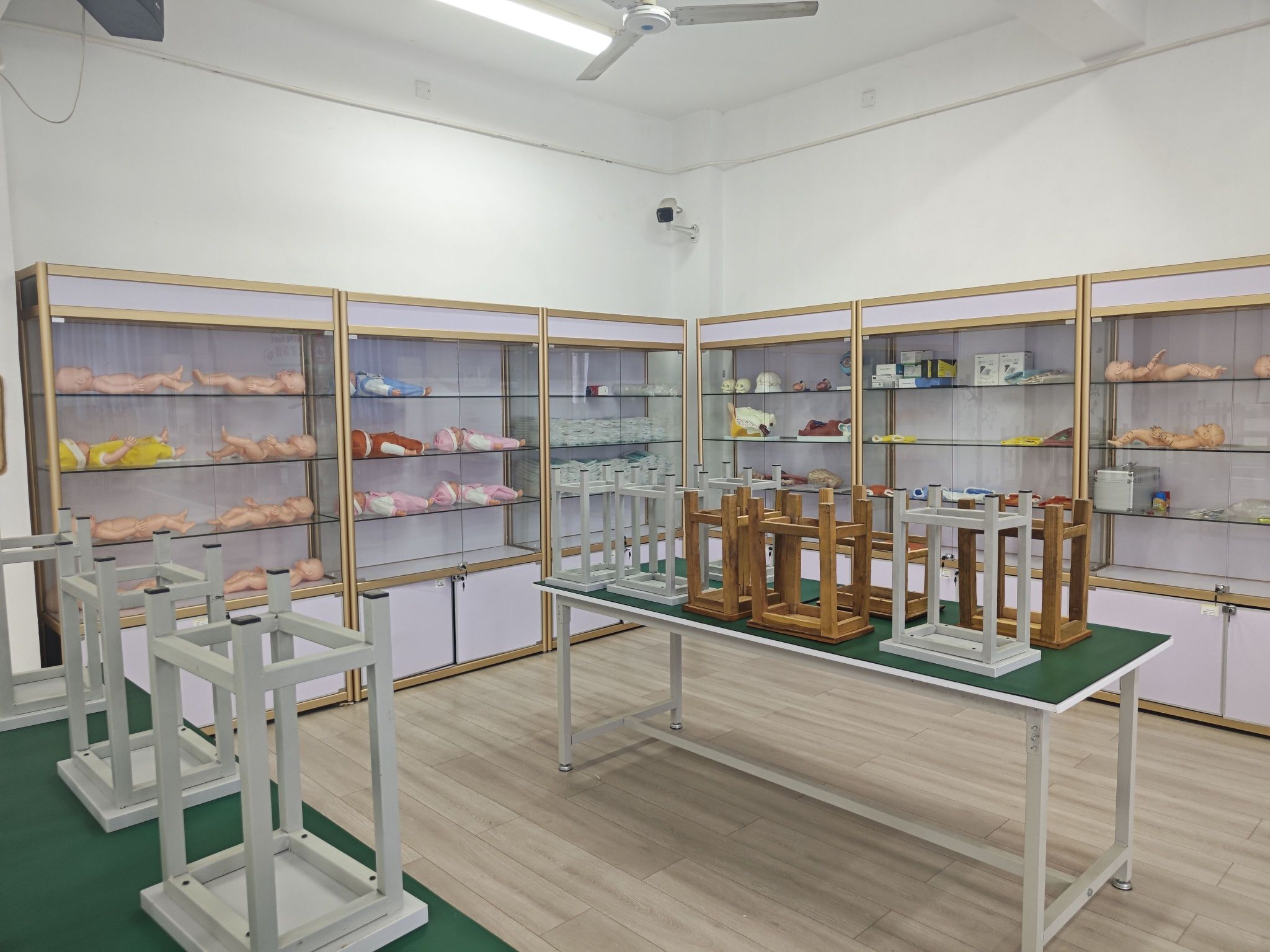 (8)613保育保健技能实训室,建筑使用面积约80㎡,该功能室内有6组模型柜,柜内摆放有急救箱、模拟实训用具、高级婴儿护理人模型、全功能三岁儿童护理模拟人、婴儿梗塞模型、五官科检查器、5个不同大小的仿真娃娃和1个带经络走向的仿真娃娃等,仿真娃娃身上的衣服和饰品大多为学前专业的学生设计和制作,锻炼学生们的设计和动手能力;室内还有4套观察桌椅,其上摆放有高级婴儿心肺复苏模拟人、高级儿童心肺复苏模拟人,方便师生学习、观摩心肺复苏急救技术;另外还有男性全身骨骼模型、人体全身层次肌肉解剖附内脏模型、电子婴儿量床、儿童电子身高体重秤等模型和设备,可供学生观摩人体组织、学习幼教相关的安全卫生知识。