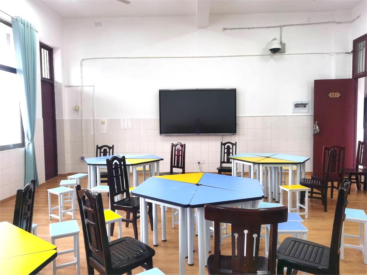 (14)813团体辅导室,位于西校区行知楼8楼西端,建筑使用面积为80m2,实验室配有1个储物柜、30套懒人沙发、绘画心理分析相关用品、OH卡牌、氛围灯、蒲团、30套拼接桌椅等物品,适用于咨询心理学、认知疗法、人本主义疗法、家庭治疗、正念减压疗法、催眠技术与应用、团体心理辅导与训练、沙盘疗法等多门课程。