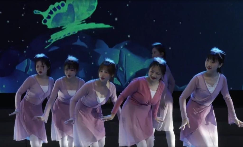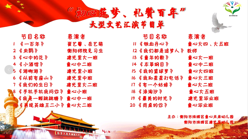 PA视讯平台2018级学前教育专业在珠晖区童心未来幼儿园进行教育见习的学生在"初心筑梦 礼赞百年"2021年幼儿园大型文艺汇演表演了《朱鹮》舞蹈节目。该文艺汇演是由珠晖区建光里幼儿园、珠晖区童心未来幼儿园联合举办的。