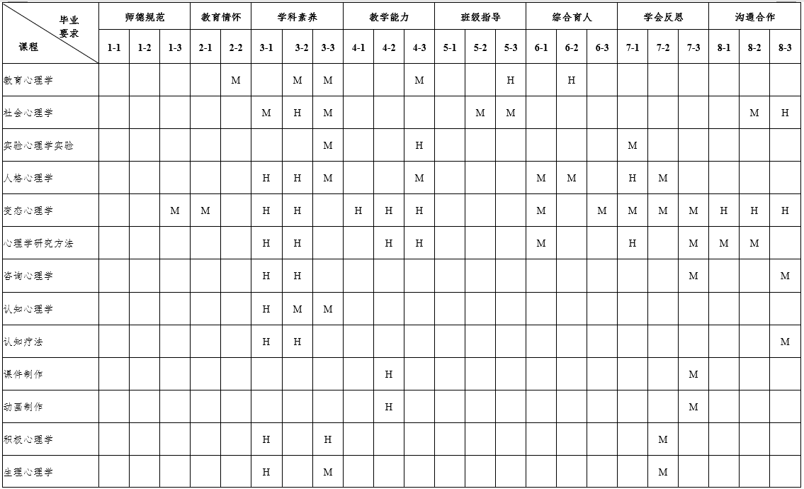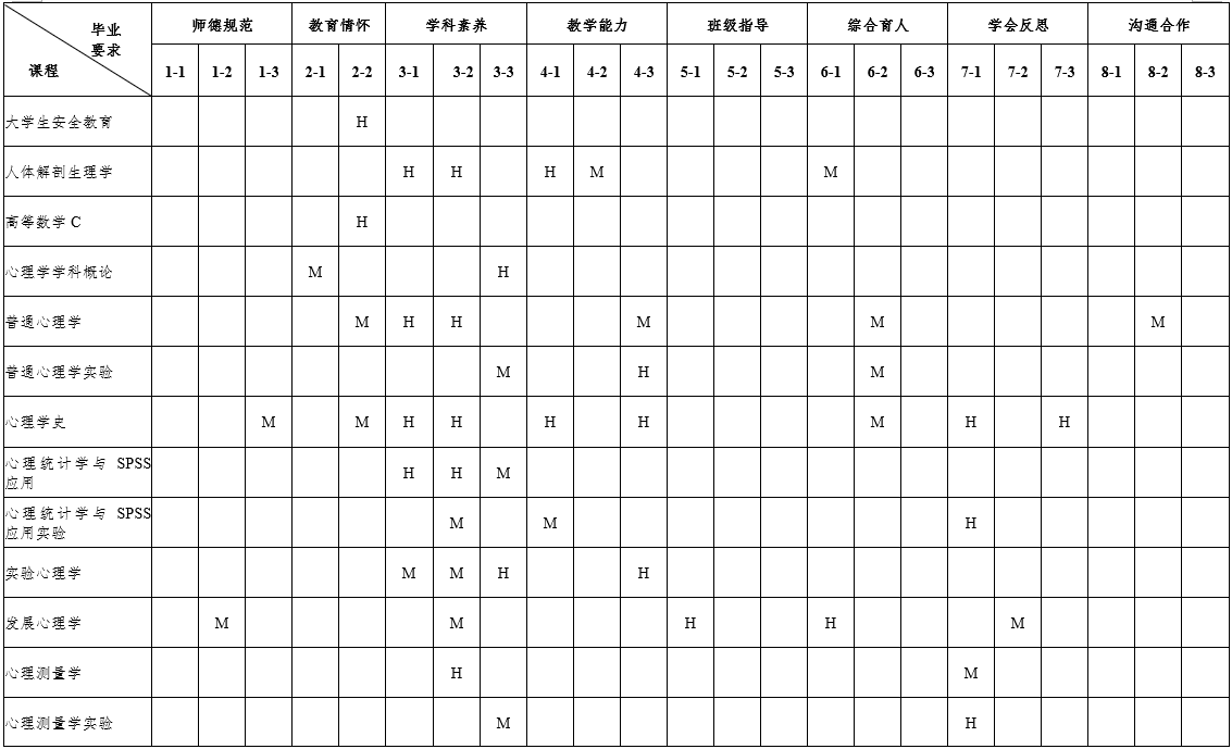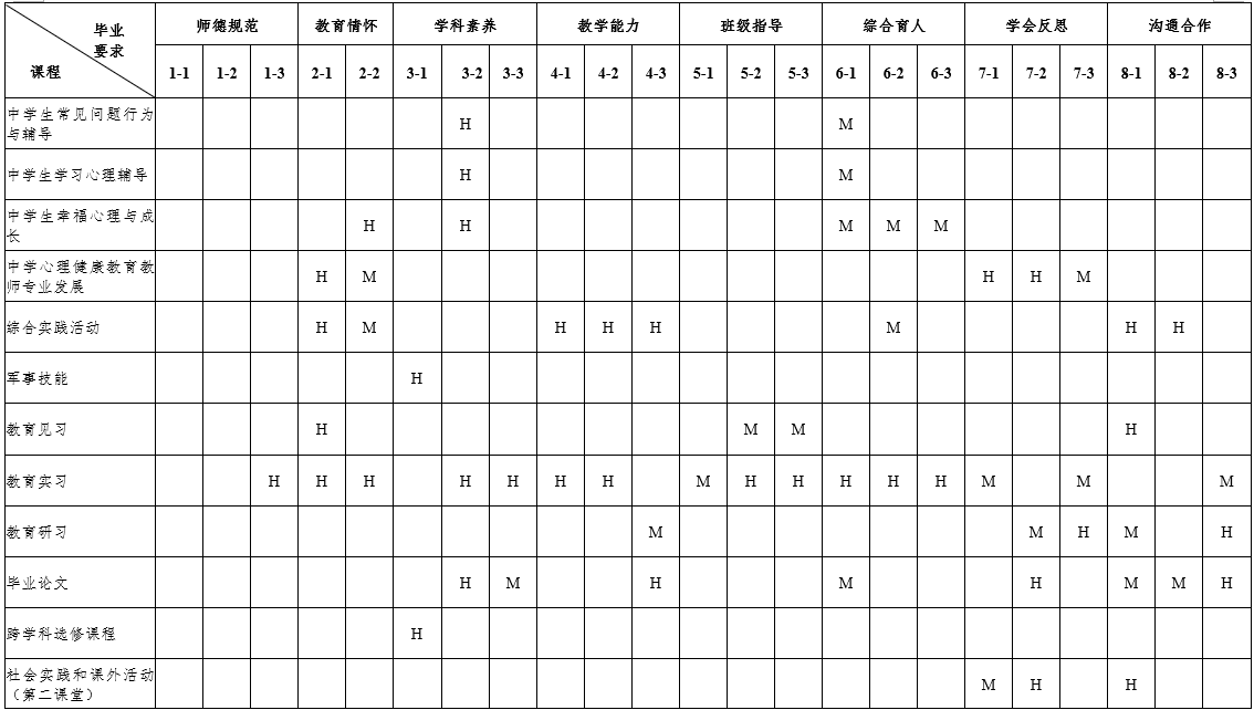 7.具有终身学习与专业发展意识。明确专业发展的方向,了解并掌握教师专业发展的基本知识和实现路径,掌握教育科学研究的基本方法,具有基于教育实践的教研能力。了解国内外基础教育改革发展动态,能够适应时代和教育发展需求自主学习,并具有对自己的职业生涯进行初步规划的能力。掌握心理健康教育活动的反思的基本方法和技能,具有一定的创新意识,能运用批判性的思维方法,学会分析和解决中学教育教学问题。 |
