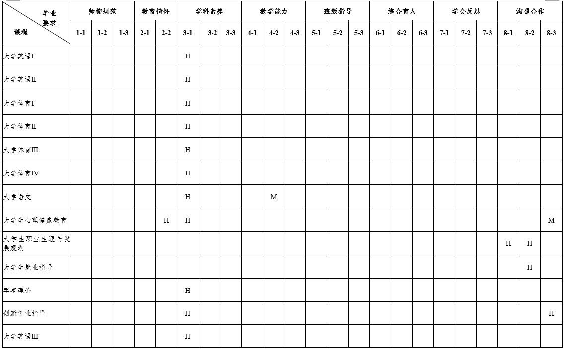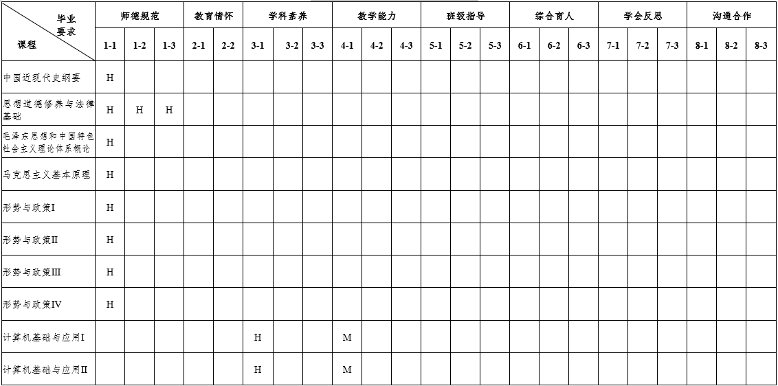 根据各门课程或实践活动的教学目标与学生能力达成的相关度,填写如下关系矩阵。用符号表示相关度:H-高度相关;M-中等相关;L-弱相关。