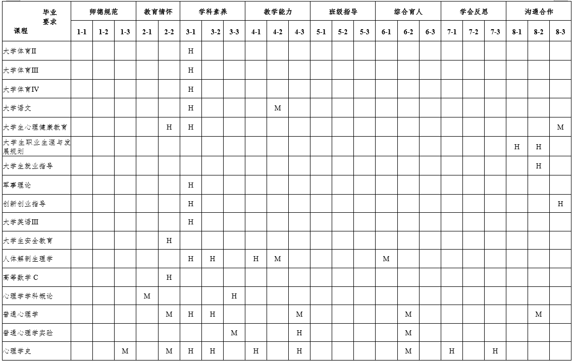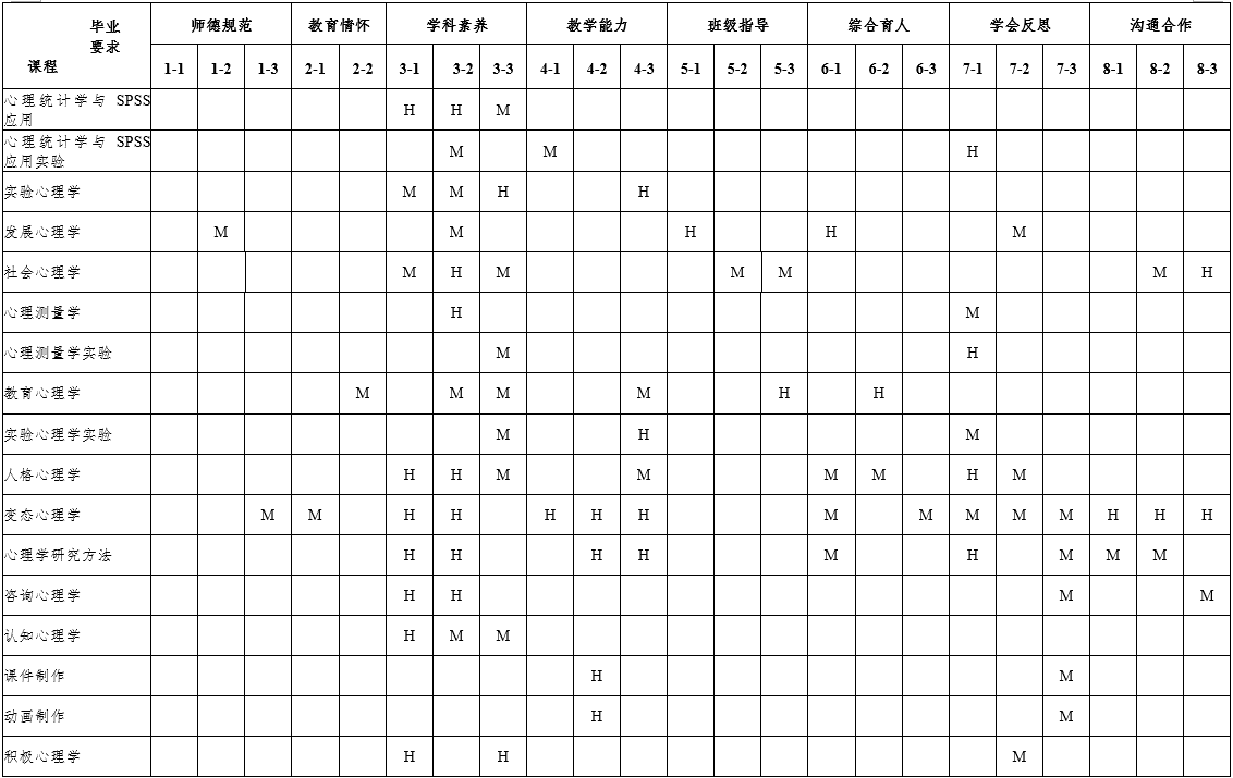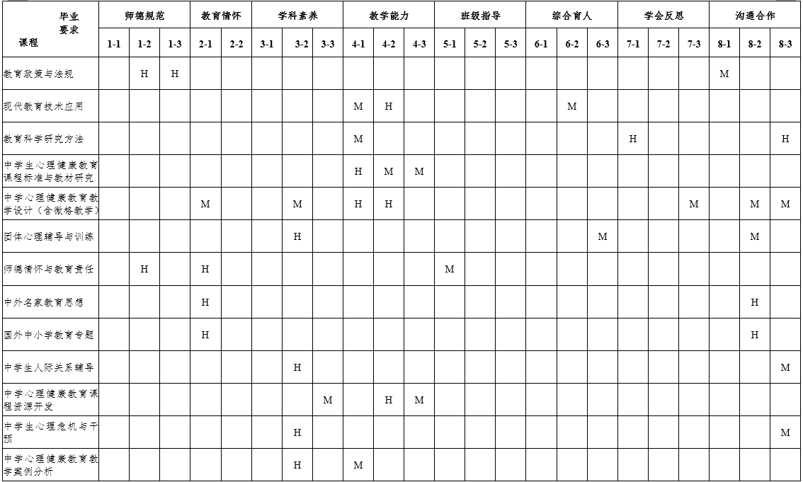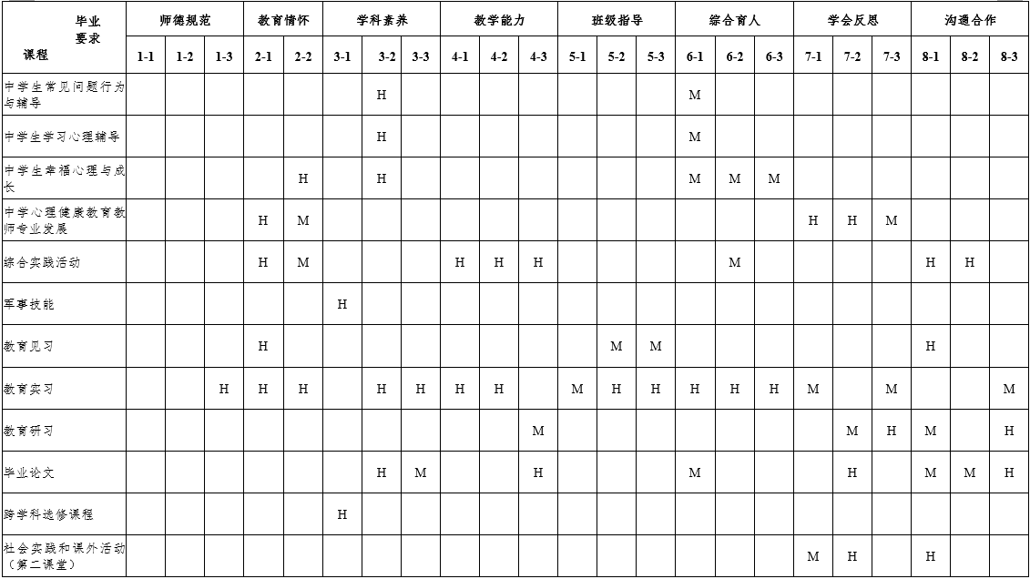 7.具有终身学习与专业发展意识。明确专业发展的方向,了解并掌握教师专业发展的基本知识和实现路径,掌握教育科学研究的基本方法,具有基于教育实践的教研能力。了解国内外基础教育改革发展动态,能够适应时代和教育发展需求自主学习,并具有对自己的职业生涯进行初步规划的能力。掌握心理健康教育活动的反思的基本方法和技能,具有一定的创新意识,能运用批判性的思维方法,学会分析和解决中学教育教学问题。 |
