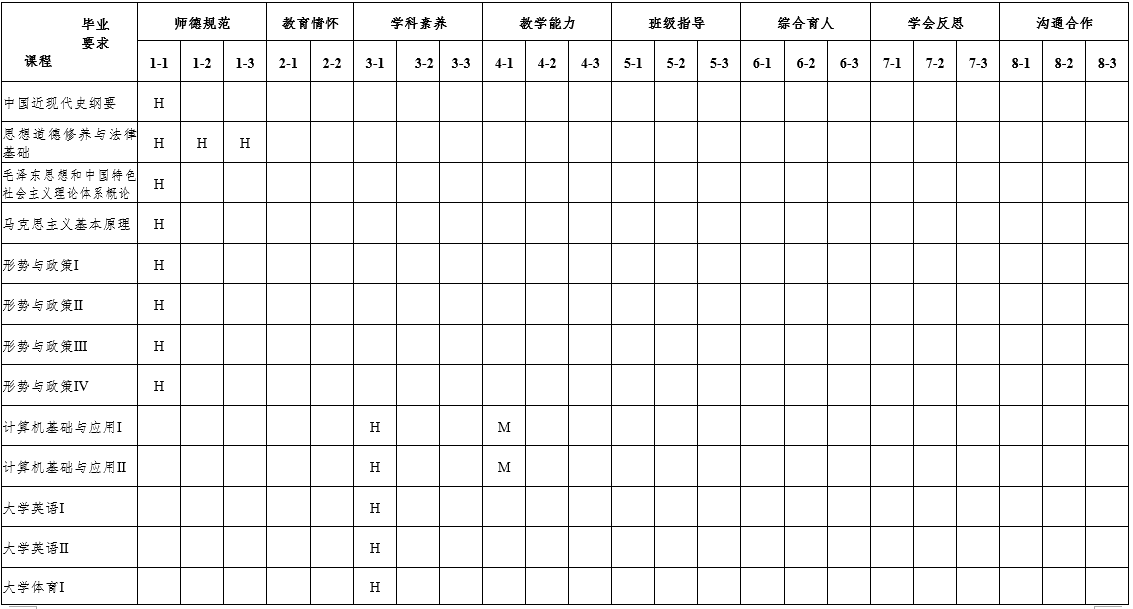 根据各门课程或实践活动的教学目标与学生能力达成的相关度,填写如下关系矩阵。用符号表示相关度:H-高度相关;M-中等相关;L-弱相关。