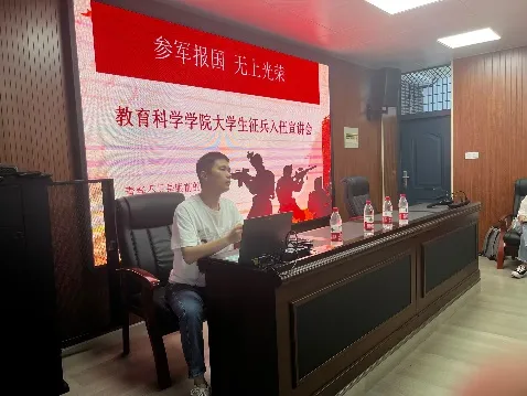 会议开始,通过观看宣讲视频,同学们对征兵的相关事宜有了初步了解。在宣讲中,几位本校退伍大学生为同学们分享自己的军旅生活。肖伊琳同学肖伊琳同学讲述自己入伍前后的转变,道出“跳出现在的生活,感受不一样的风景”的初心;法学院的吴均潮同学法学院的吴均潮同学通过一张张站岗的照片向同学们展现认真刻苦对待自己每一班岗的军人操守;体育科学学院的屈洁同学体育科学学院的屈洁同学再现自己海军军旅生活的惊险时刻,巾帼不让须眉的她勇敢代表海军喊话他国军舰的故事激发了同学们强烈爱国爱军的热情。接着,校武装部征兵专干曾超老师详细介绍征兵时间、征兵政策和征兵流程,为同学们答疑解惑。