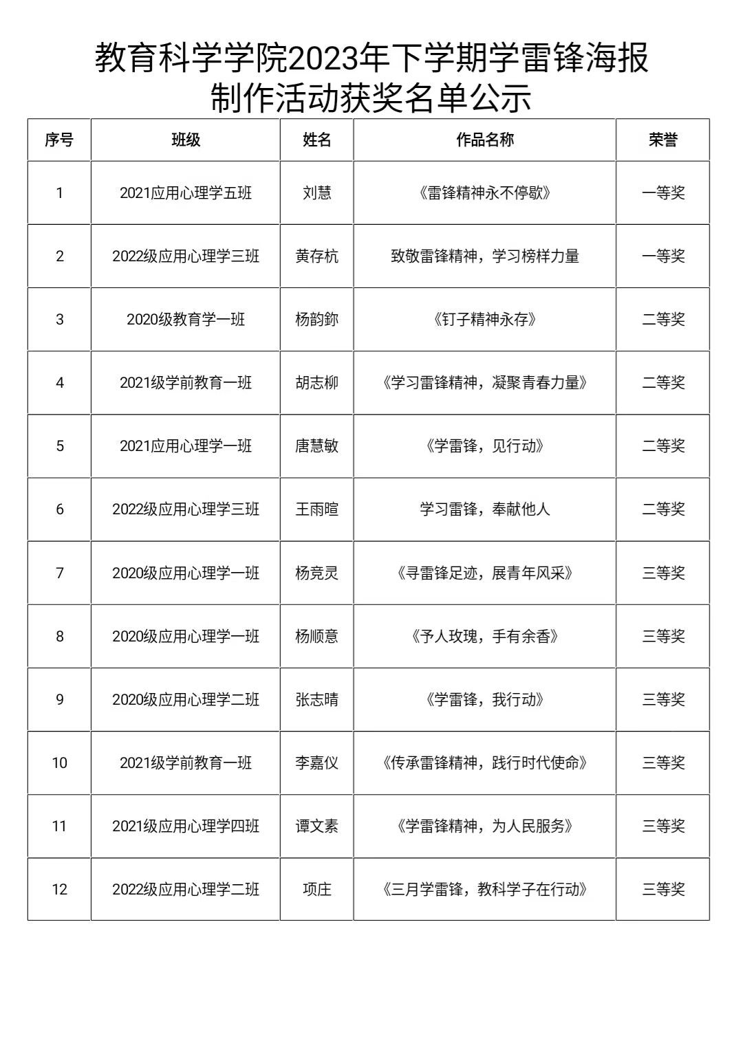 附件:PA视讯平台2023年下学期学雷锋海报制作活动获奖作品名单表