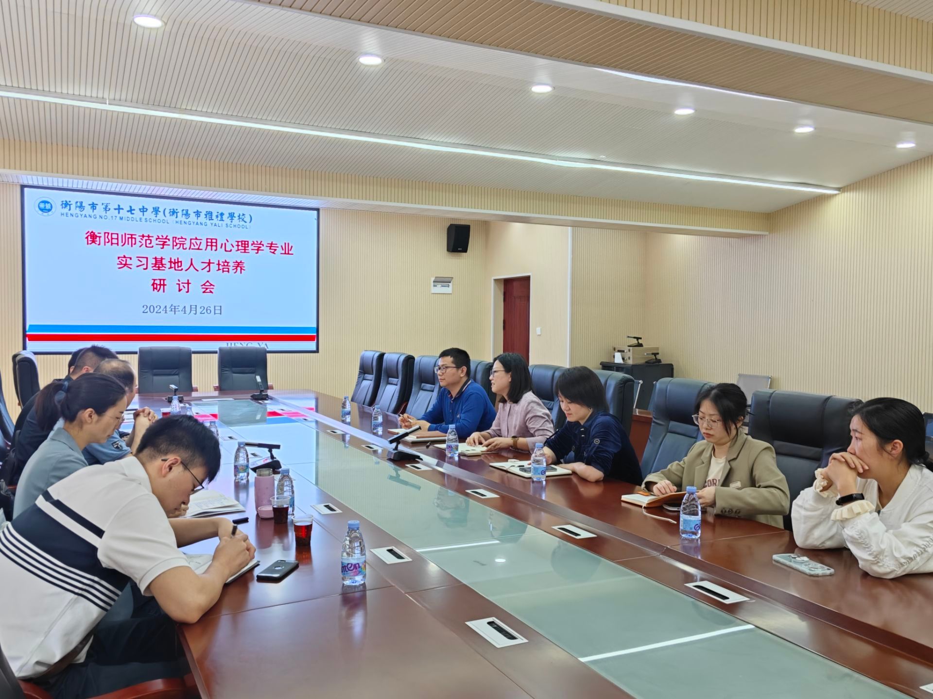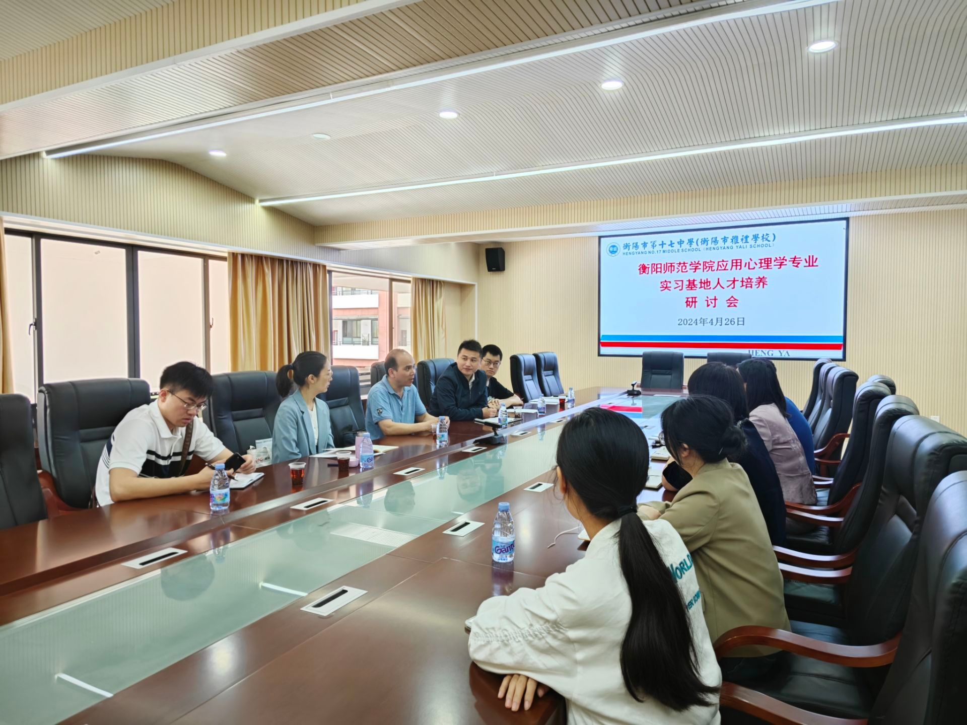 4月26日上午,PA视讯平台教学副院长梁文明、心理学系主任刘罗,以及心理学系教师卢鑫、夏骁凯、陈艳,一行五人前往应用心理学专业实践教学基地衡阳市第十七中学开展人才培养研讨会,衡阳市第十七中学校长兼应用心理学专业实践教学基地负责人袁敏及副校长华嵘、心理健康教研组组长邹林杰、教师王若逸、杨佩共同出席。