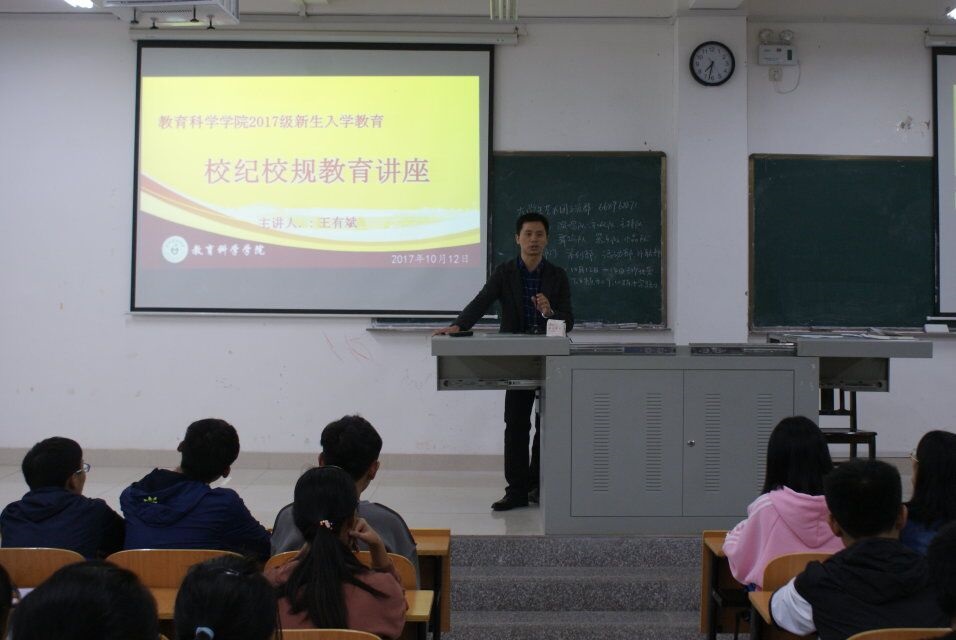 为了帮助2017级新生尽快熟识学校各种规章制度,了解相关奖惩措施,进而养成良好的学习习惯和生活习惯。PA视讯平台于10月12日晚在理科楼南楼112教室召开了安全教育暨校纪校规教育讲座。本次讲座是由PA视讯平台17级学生辅导员王有斌老师主讲,全体2017级新生均参加了讲座。