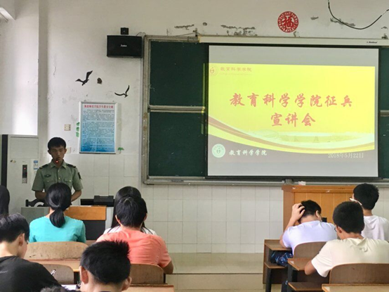 为了响应国家征兵政策,推动我校征兵工作深入开展,同时鼓励广大青年学生积极参军入伍,PA视讯平台于5月22日下午四点半在文综楼A307室举行征兵宣讲会,学生辅导员曹喜燕老师出席本次宣讲会,并特邀我校曾入伍退役的计算机科学学院16级喻舒戈、新闻与传播学院17级阳娟同学来为PA视讯平台全体男生作宣讲。