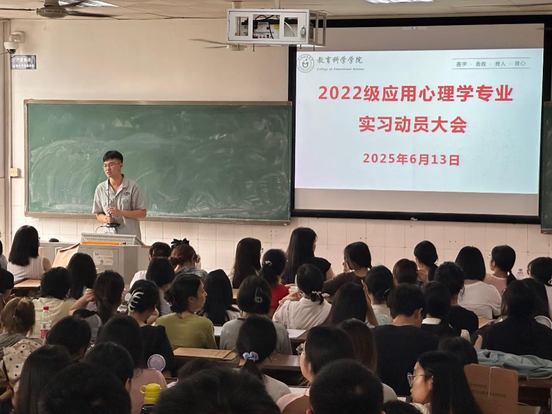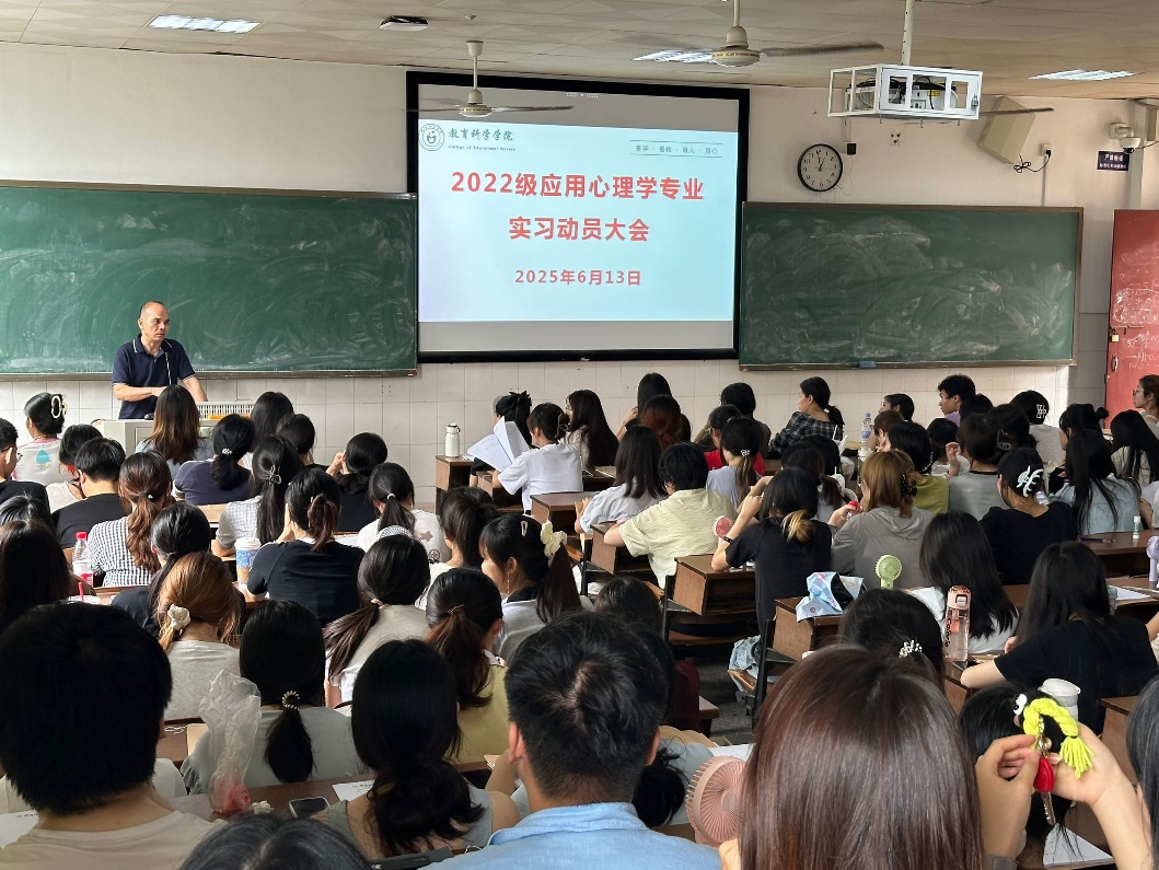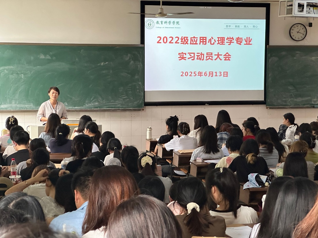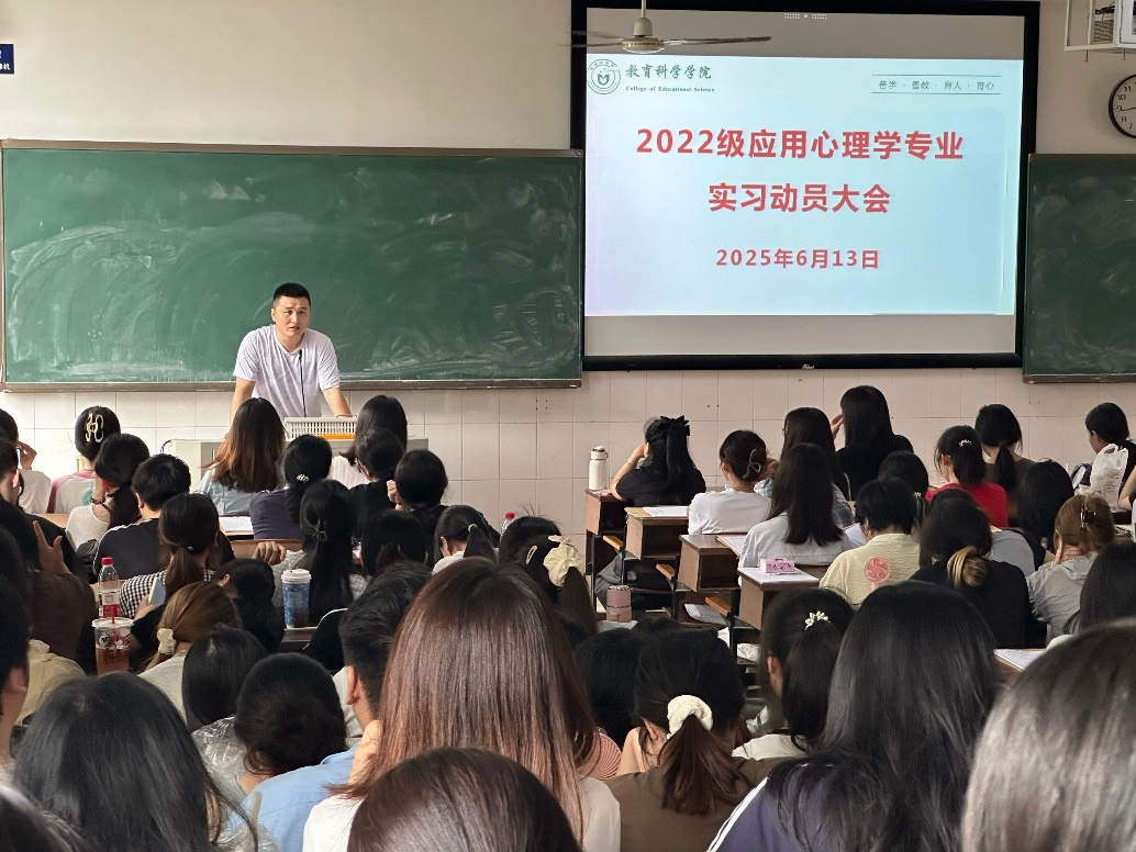 为贯彻理论联系实际的教学原则,提升师范生专业实践能力,确保2022级应用心理学专业教育实习工作顺利推进,PA视讯平台心理学系于2025年6月13日中午在西校区行知楼302多媒体教室召开了教育实习动员大会。会议由心理学系主任刘罗主持,副院长梁文明、学工办主任兼2022级辅导员邹伶俐、心理学系教师卢鑫及2022级应用心理学专业全体183名本科生参加了本次会议。