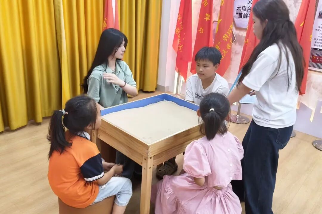 村委会的专业心理沙盘室摇身变为“心灵游乐园”。沙盘游戏由志愿者张静主持,恐龙、城堡、森林、小动物等沙具供孩子们自由挑选,在沙盘中构建独一无二的场景。在志愿者罗思琪的引导下,孩子们将喜爱的沙具自由布局,勾勒出内心世界的图景。志愿者通过“哪个部分最吸引你?”“若调整一处会选哪里?”等开放式提问,引导孩子阐述创作思路,同时观察其语气、表情,捕捉“孤独”“保护”“希望”等情绪信号,建立情感联结,助力孩子借沙盘倾诉心声、释放情绪、发掘潜能。