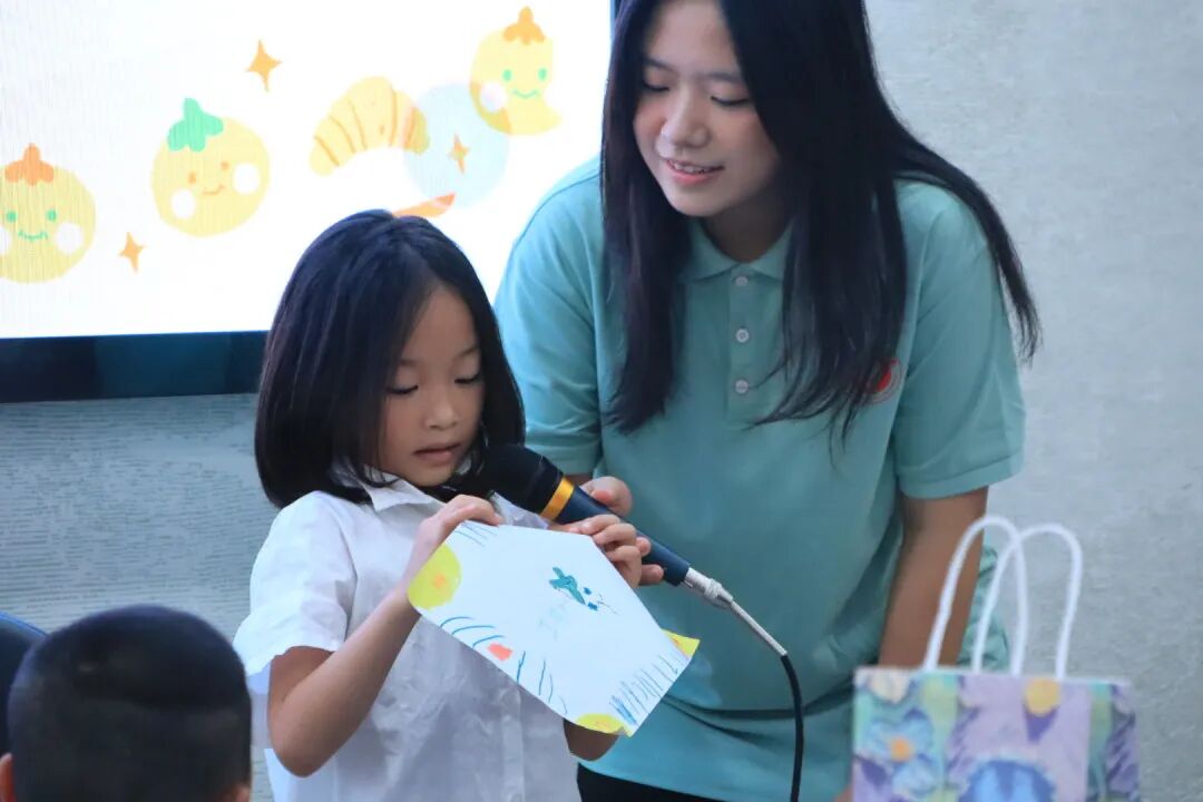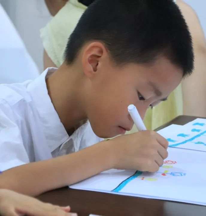 曼陀罗绘画环节,志愿者张骆、姚钰鼓励孩子们用彩笔涂抹出内心最真实的色彩。“红色是甜甜的苹果!”“蓝色像躺在草地看云的惬意”孩子们争相分享,将热情赋予红色,让宁静融入蓝色,把生机绘进绿色,用紫色藏起小秘密。他们伏案创作,有人绘出“太阳花乐园”,有人勾勒“星空下的小屋”,无需技巧,只需将心情倾注笔尖,每幅作品都是独特的心灵叙事。展示环节,小朋友们踊跃分享画作,讲述色彩背后的温暖与快乐,让情绪在交流中进一步舒展。