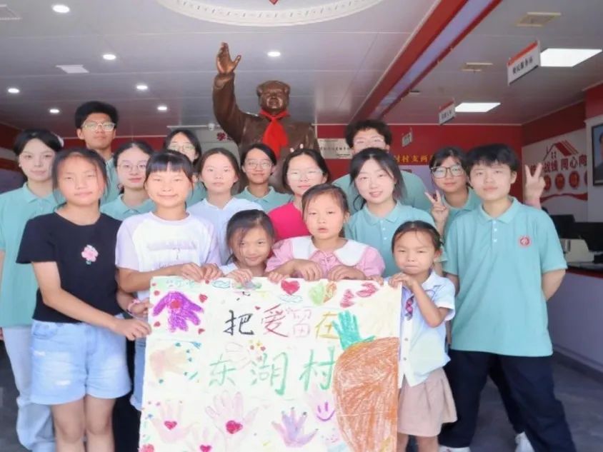 歌声嘹亮结硕果,双向奔赴启新程。在结束仪式上,团队深情回顾了五天来的实践历程与丰硕成果。当承载着团队智慧与情感的DIY旗帜在会场展开,全体志愿者与村民代表共同唱响《那些花儿》时,嘹亮的歌声与热烈的掌声汇聚成激动人心的乐章,将现场气氛推向最高潮。东湖村相关负责人在仪式上高度评价了团队的辛勤付出与专业素养,盛赞活动“不仅为孩子们带来了知识和快乐,为老人们送去了温暖和陪伴,更以专业和热情为东湖村的振兴注入了蓬勃的青春动能。”