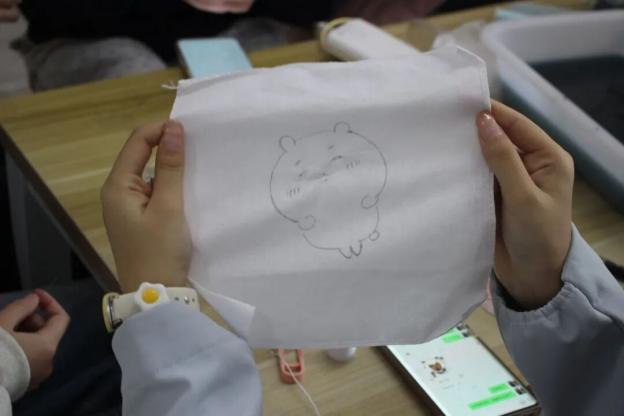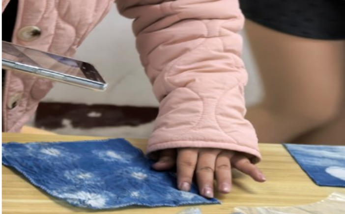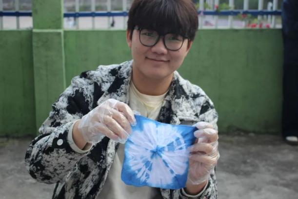 活动现场,同学们纷纷拿起纯白棉布,运用皮筋、木夹、冰棍棒等工具,通过绞、扎、捆、缝等手法进行创意造型。有的同学精心设计各种图案,有的随心而作,期待偶然天成的惊喜。在染色过程中,随着布料在靛蓝染缸中侵染、氧化,原本