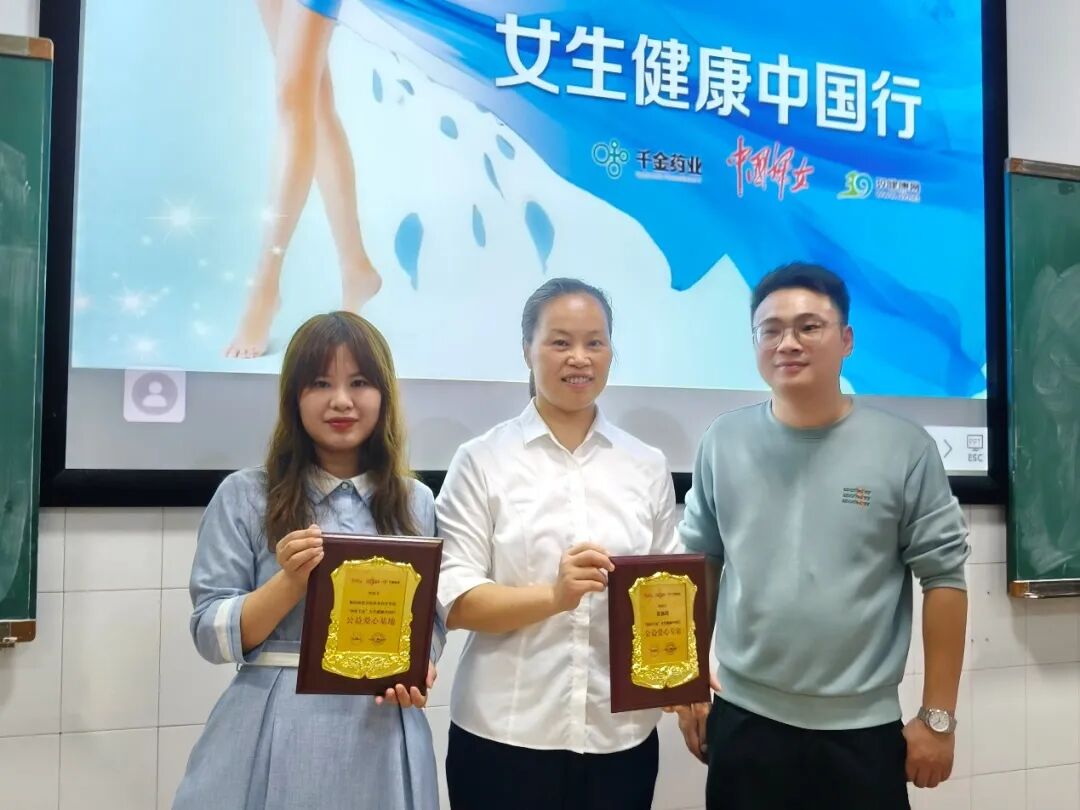 义诊与献花环节结束后,辅导员单老师、董主任与邹老师上台完成授牌仪式,标志着校企医合作进一步深化,为后续大学生健康平台搭建筑牢基础。讲座收尾阶段,主持人再次致谢专家团的专业支持、千金药业的协同配合及新生的积极参与,并寄语新生将所学知识运用到生活中,以科学方式守护自身健康。