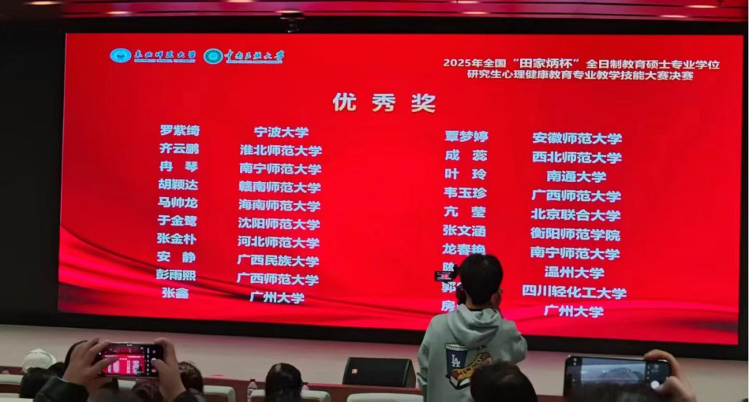 2025年全国“田家炳杯”全日制教育硕士专业学位研究生心理健康教育专业教学技能大赛于10月19日圆满落下帷幕。其中,由唐芳贵副校长、尹洁教授指导的3位参赛研究生均获佳绩:袁熠烽同学获得全国一等奖,田熠同学获得全国三等奖,张文涵同学获得全国优秀教学设计奖,实现了该竞赛一等奖的突破。