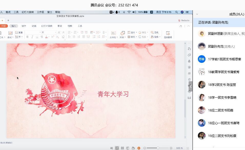 此次会议一共分为三部分。第一部分,由分团委副书记林丽影提到五四青年节当天,团中央将在各大网络平台同步举办“让青春为祖国绽放”网上主题团日活动,并强调PA视讯平台所有团支部中的团员青年、团干部需通过各线上平台参与网上主题团日活动。要求各班精心组织、收集相关材料并及时报送材料。第二部分,由分团委副书记孙先范讲解PA视讯平台青年大学习学院团课学习方式以及制度的变化。主要包括四个方面,一是团课学习覆盖率要达100%;二是团课截图有截图变化以及收集截图的时间变化;三是覆盖率未达标会有相应综测惩罚;四是16级各班也要积极参与团课学习。第三部分,由团课注册学习率较高的团支书简单交流自己的想法与方法。各班团支书都表示,通过将要求转发至班级群及寝室长群的方式,让同学们先自主完成学习,再由团支书督促寝室长让未学习的同学尽快学习。各班同学以此方式养成习惯,自主完成团课学习,提高团课注册学习率。