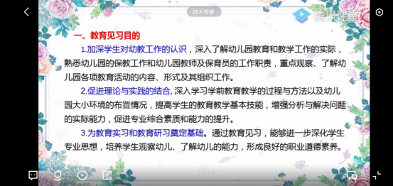 教育见习是学前教育专业教学计划的重要组成部分,是培养学前教育师资的基本环节。由于受到新冠疫情影响,无法开展线下教育见习,鉴于此,PA视讯平台教务处同意各学院开展线上教育见习。为了切实做好本次线上教育见习工作,PA视讯平台学前教育教研室特此于6月15日10:00-10:30在腾讯课堂上举行线上见习动员大会,做好见习前的各项准备与安排工作。根据学前教育专业教学计划的安排,本次见习为期一周,定于2020年6月15日至2020年6月19日。