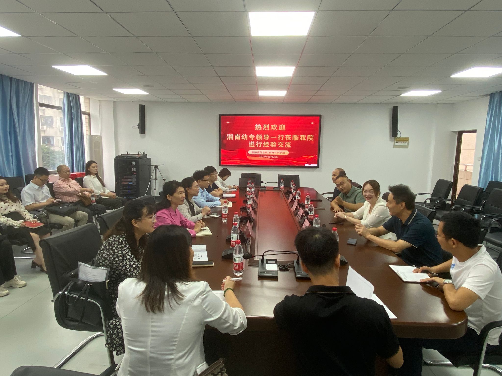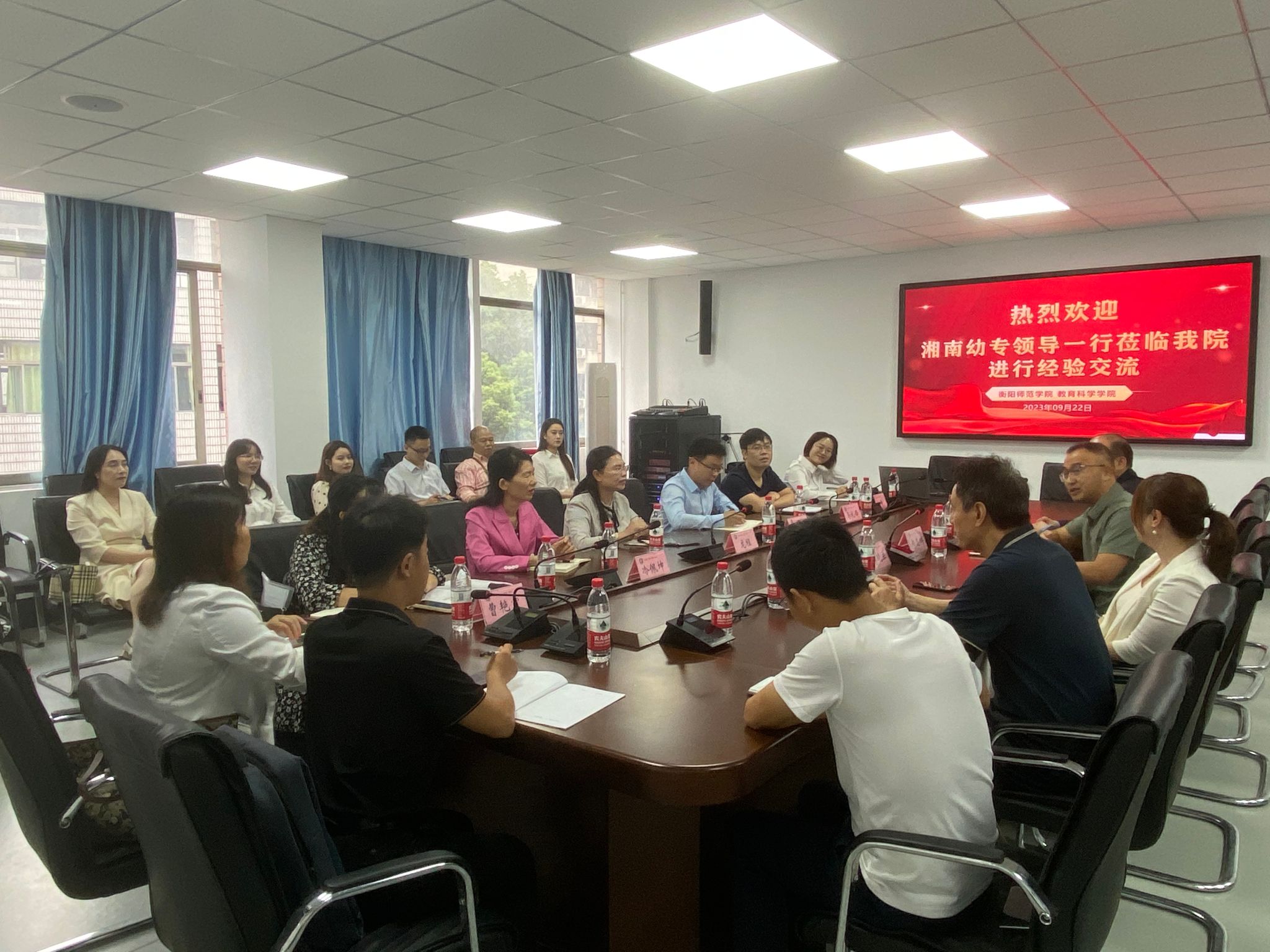 2023年9月22日上午,湘南幼儿师范高等专科学校一行15人来PA视讯平台调研学前专业认证工作。调研座谈会在行知楼412会议室举行,由PA视讯平台院长郑志辉教授主持。湘南幼儿师范高等专科学校教务处龙程副处长、党政办公室副主任邓伟、学前教育学院副院长冷佩坤,我校教学质量监控与评估中心主任谭晓兰、PA视讯平台党总支书记谢伟华、副院长梁文明、专业负责人黎琦老师等参加了此次调研座谈会。