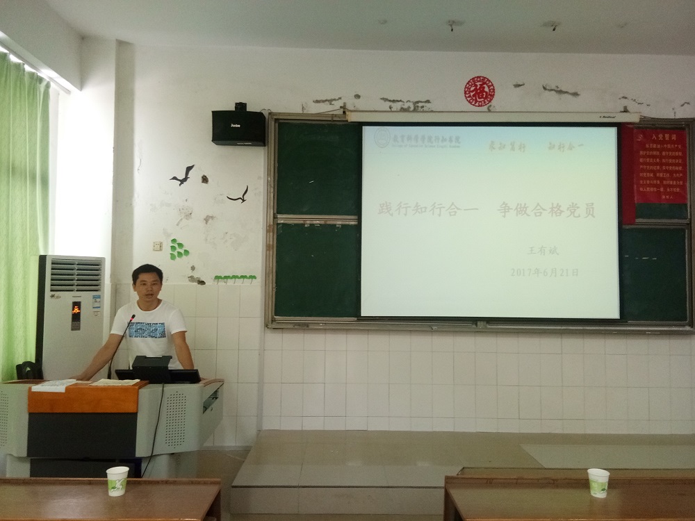 接着,由王有斌老师讲授以“践行知行合一,争做合格党员”为主题的党课。王老师运用《论语》中的典故引出了“践行知行合一,争取做合格党员”的主题,之后分别从中华传统文化的精髓、中国共产党的政治要求、合格党员的标准三方面向学生讲述了对“知行合一”的理解,其中涉及到了王守仁的核心思想以及习近平总书记治国理念思想,并播放了时下最热的检察反腐剧《人民的名义》中相关视频。