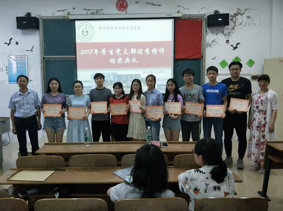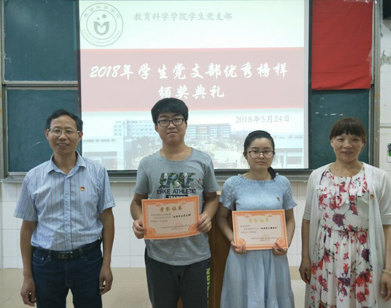 5月24日下午18:50,PA视讯平台学生党支部在文A307室举行2018年党支部“优秀榜样”颁奖典礼。党总支书记陈君生、党总支副书记罗耒英出席典礼,全体学生党员参加。