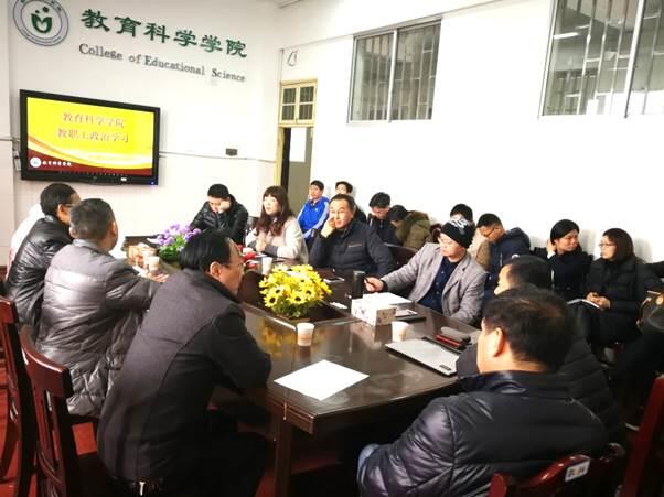 然后陈书记就学习贯彻全国教育大会精神提出了二点要求,一是认真学习领会习近平总书记在全国教育大会上的讲话精神,提高思想认识;二是把学习全国教育大会精神与迎接教育部本科教学工作审核评估相结合,扎实做好本职工作,以优秀的成绩提升学院办学水平。
