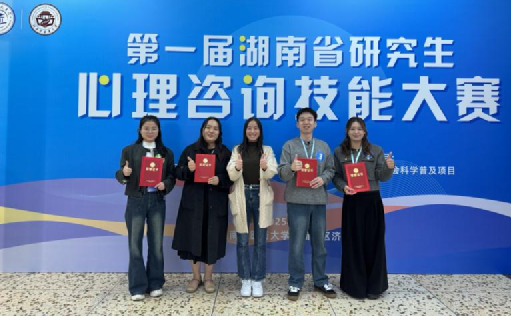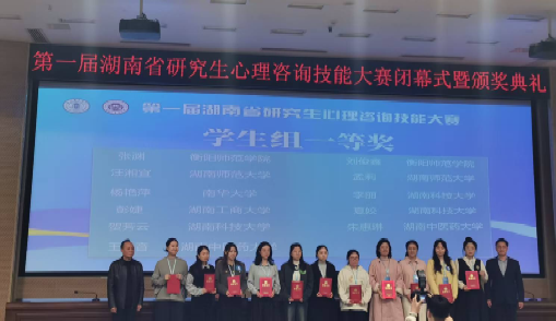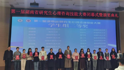 2025年11月15日,由湖南省教育厅主办的第一届湖南省研究生心理咨询技能大赛圆满落幕。由王彩凤博士带队的研究生代表队凭借扎实的专业基础、精湛的咨询技能和出色的临场表现,历经多轮激烈角逐,最终斩获佳绩:张渊、刘俊鑫同学荣获一等奖;吴一凡、李雅婷同学荣获二等奖;吴颖同学荣获三等奖。