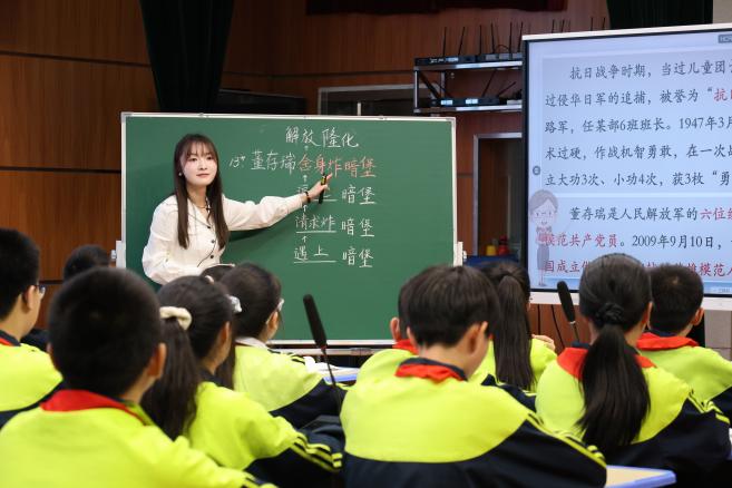 刘嘉欣老师为六年级学生讲授《董存瑞舍身炸暗堡》,声情并茂讲述英雄事迹,激发课堂讨论,引导学生体会英雄精神,厚植爱国情怀。