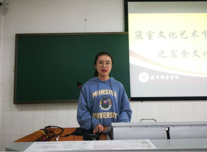 在整个宿舍文化论坛的过程中,首先上台进行宿舍文化展示的是来自18级学前教育二班的4A218宿舍,她们的宿舍代表伴随着音乐以PPT的形式向大家展示了她们温馨的寝室,分享了关于她们宿舍四个人有趣而又温暖的小故事,让人深受感触。在活动进行了一半的时候,上台进行宿舍文化展示的是此次唯一一个参加宿舍文化论坛的男生宿舍的代表,他来自19级应用心理学二班12A223宿舍。他以《平凡的寝室,活出不平凡的生活》为题,向大家展示了四个阳光活泼、积极向上的男生的宿舍生活。他从寝室内貌、寝室成员、寝室活动、寝室目标四个方面向大家生动地分享了他们的宿舍生活。整个宿舍文化论坛的压轴出场是来自19级学前教育二班的10A623宿舍,上台向大家进行分享展示的是她们宿舍来自北方的寝室长,她通过讲述自己的经历以及与自己室友生活的点点滴滴向大家分享了她们623的那些事。最后,主持人对此次活动进行了总结并宣布此次宿舍文化论坛圆满结束。